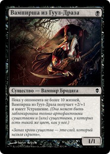 | Rules | As long as an opponent has 10 or less life, Guul Draz Vampire gets +2/+1 and has intimidate. (It can't be blocked except by artifact creatures and/or creatures that share a color with it.) |