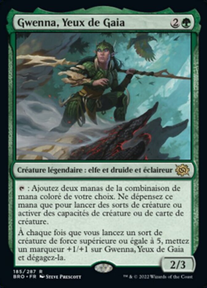 | Rules | : Add two mana in any combination of colors. Spend this mana only to cast creature spells or activate abilities of a creature or creature card. Whenever you cast a creature spell with power 5 or greater, put a +1/+1 counter on Gwenna, Eyes of Gaea and untap it. |