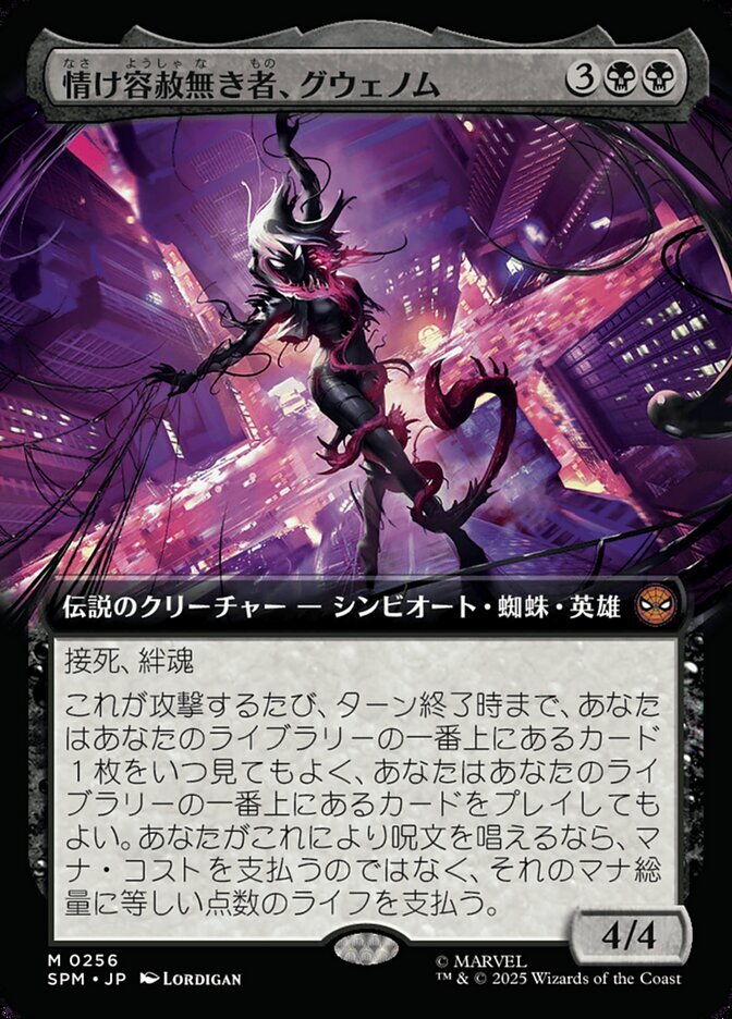 | Rules | Deathtouch, lifelink Whenever Gwenom attacks, until end of turn you may look at the top card of your library any time and you may play cards from the top of your library. If you cast a spell this way, pay life equal to its mana value rather than pay its mana cost. |