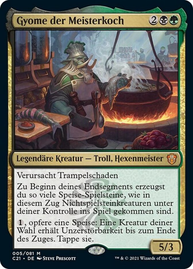 | Rules | Trample At the beginning of your end step, create a number of Food tokens equal to the number of nontoken creatures you had enter the battlefield under your control this turn. , Sacrifice a Food: Target creature gains indestructible until end of turn. Tap it. |