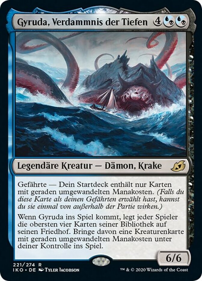 | Rules | Companion — Your starting deck contains only cards with even mana values. (If this card is your chosen companion, you may put it into your hand from outside the game for any time you could cast a sorcery.) When Gyruda enters the battlefield, each player mills four cards. Put a creature card with an even mana value from among the milled cards onto the battlefield under your control. |