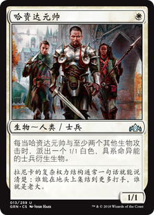 | Rules | Whenever Haazda Marshal and at least two other creatures attack, create a 1/1 white Soldier creature token with lifelink. |