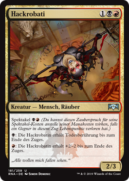 | Rules | Spectacle (You may cast this spell for its spectacle cost rather than its mana cost if an opponent lost life this turn.) : Hackrobat gains deathtouch until end of turn. : Hackrobat gets +2/-2 until end of turn. |