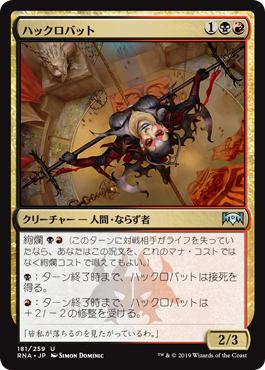 | Rules | Spectacle (You may cast this spell for its spectacle cost rather than its mana cost if an opponent lost life this turn.) : Hackrobat gains deathtouch until end of turn. : Hackrobat gets +2/-2 until end of turn. |
