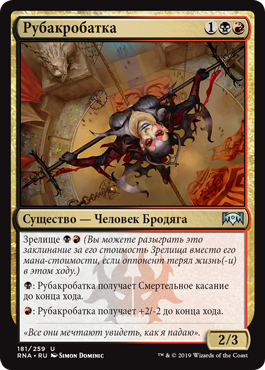 | Rules | Spectacle (You may cast this spell for its spectacle cost rather than its mana cost if an opponent lost life this turn.) : Hackrobat gains deathtouch until end of turn. : Hackrobat gets +2/-2 until end of turn. |