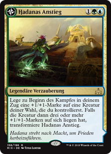 | Rules | At the beginning of combat on your turn, put a +1/+1 counter on target creature you control. Then if that creature has three or more +1/+1 counters on it, transform Hadana's Climb. // (Transforms from Hadana's Climb.) : Add one mana of any color. , : Target creature you control gains flying and gets +X/+X until end of turn, where X is its power. |