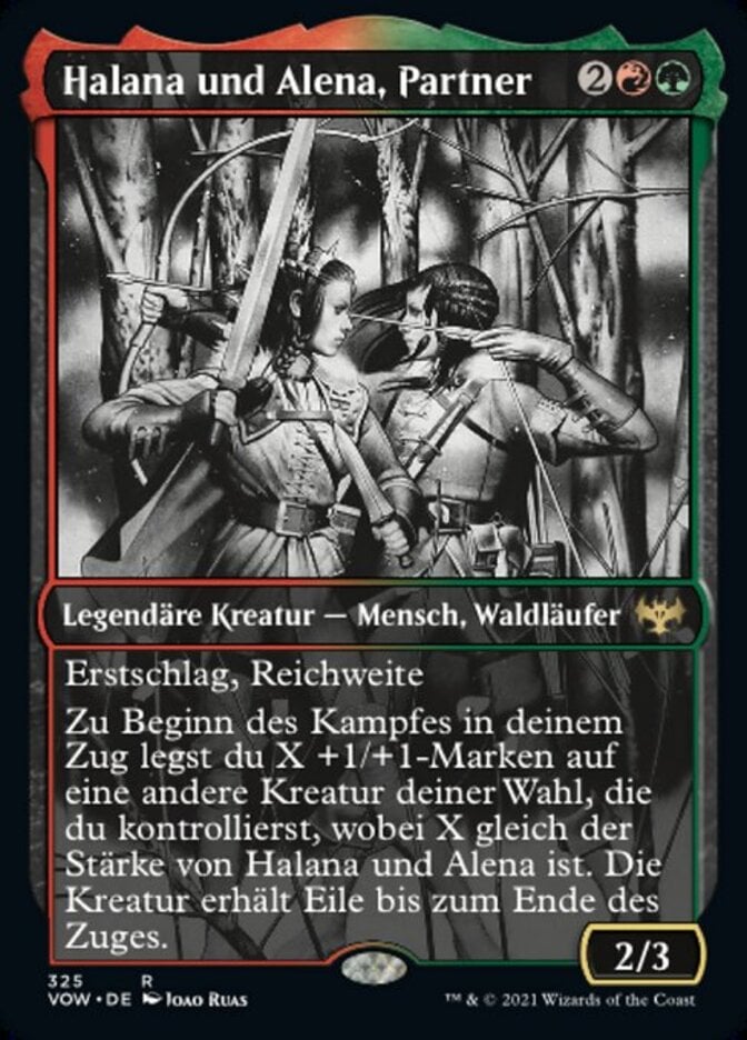 | Rules | First strike, reach At the beginning of combat on your turn, put X +1/+1 counters on another target creature you control, where X is Halana and Alena's power. That creature gains haste until end of turn. |