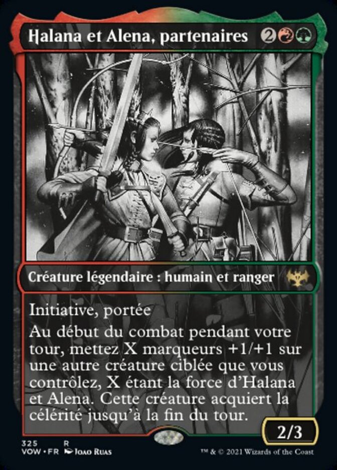 | Rules | First strike, reach At the beginning of combat on your turn, put X +1/+1 counters on another target creature you control, where X is Halana and Alena's power. That creature gains haste until end of turn. |