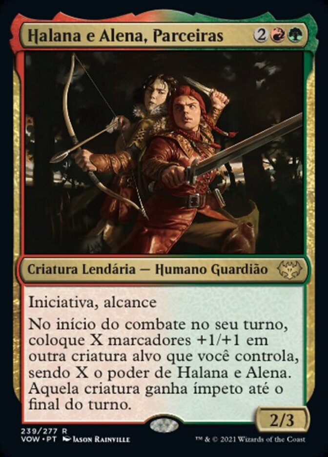 | Rules | First strike, reach At the beginning of combat on your turn, put X +1/+1 counters on another target creature you control, where X is Halana and Alena's power. That creature gains haste until end of turn. |