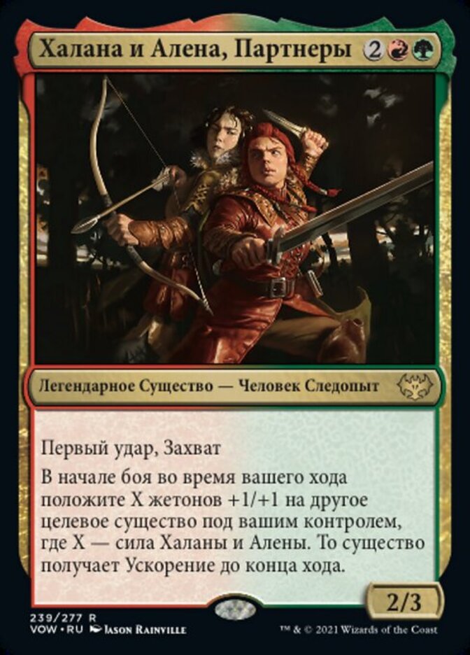 | Rules | First strike, reach At the beginning of combat on your turn, put X +1/+1 counters on another target creature you control, where X is Halana and Alena's power. That creature gains haste until end of turn. |