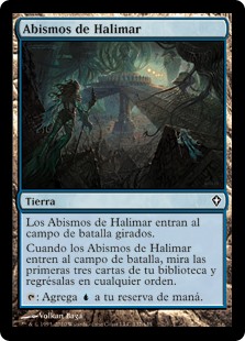 | Rules | Halimar Depths enters the battlefield tapped. When Halimar Depths enters the battlefield, look at the top three cards of your library, then put them back in any order. : Add . |