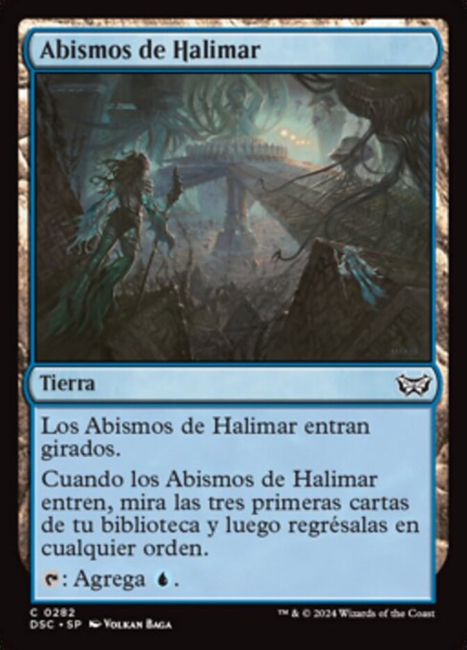 | Rules | Halimar Depths enters the battlefield tapped. When Halimar Depths enters the battlefield, look at the top three cards of your library, then put them back in any order. : Add . |