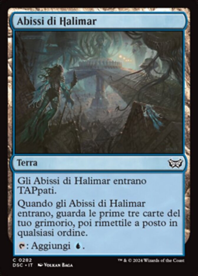 | Rules | Halimar Depths enters the battlefield tapped. When Halimar Depths enters the battlefield, look at the top three cards of your library, then put them back in any order. : Add . |