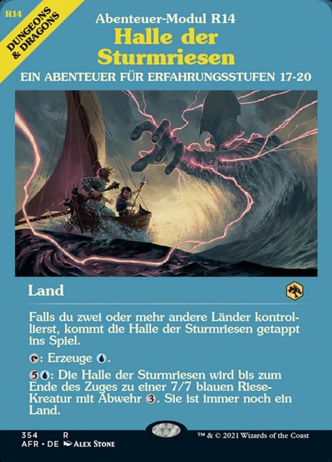 | Rules | If you control two or more other lands, Hall of Storm Giants enters the battlefield tapped. : Add . : Until end of turn, Hall of Storm Giants becomes a 7/7 blue Giant creature with ward . It's still a land. (Whenever it becomes the target of a spell or ability an opponent controls, counter it unless that player pays .) |