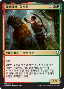 | Rules | Trample Whenever you cast a spell, if that spell was kicked, put a +1/+1 counter on Hallar, the Firefletcher, then Hallar deals damage equal to the number of +1/+1 counters on it to each opponent. |