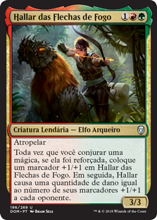 | Rules | Trample Whenever you cast a spell, if that spell was kicked, put a +1/+1 counter on Hallar, the Firefletcher, then Hallar deals damage equal to the number of +1/+1 counters on it to each opponent. |
