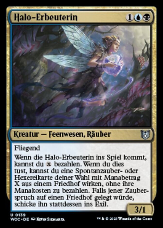 | Rules | Flying When Halo Forager enters the battlefield, you may pay . When you do, you may cast target instant or sorcery card with mana value X from a graveyard without paying its mana cost. If that spell would be put into a graveyard, exile it instead. |