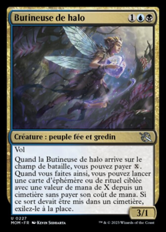 | Rules | Flying When Halo Forager enters the battlefield, you may pay . When you do, you may cast target instant or sorcery card with mana value X from a graveyard without paying its mana cost. If that spell would be put into a graveyard, exile it instead. |