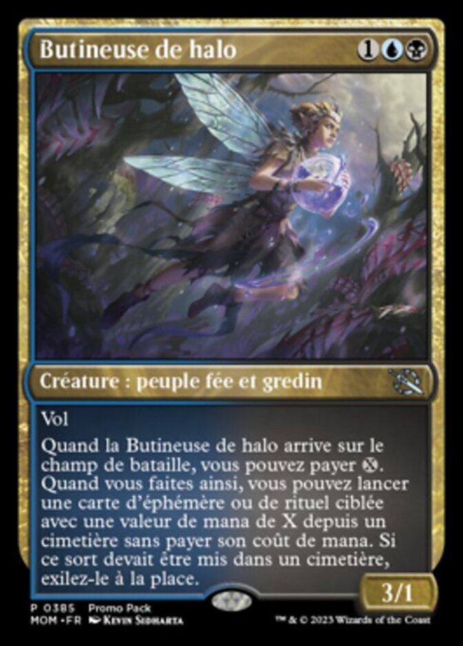 | Rules | Flying When Halo Forager enters the battlefield, you may pay . When you do, you may cast target instant or sorcery card with mana value X from a graveyard without paying its mana cost. If that spell would be put into a graveyard, exile it instead. |