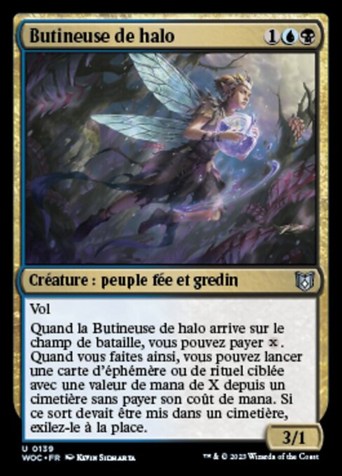 | Rules | Flying When Halo Forager enters the battlefield, you may pay . When you do, you may cast target instant or sorcery card with mana value X from a graveyard without paying its mana cost. If that spell would be put into a graveyard, exile it instead. |