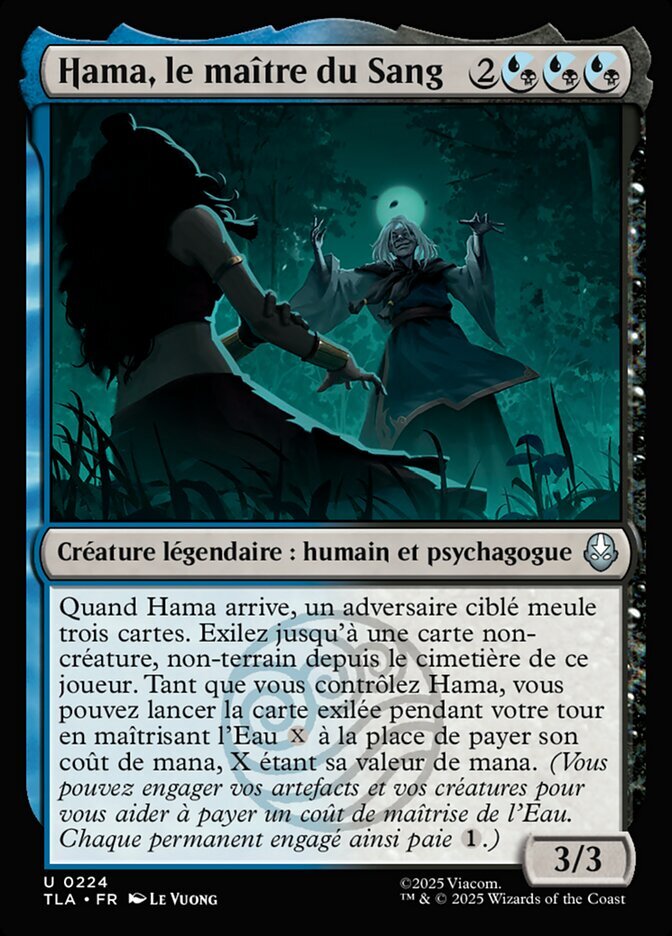 Rules When Hama enters, target opponent mills three cards. Exile up to one noncreature, nonland card from that player's graveyard. For as long as you control Hama, you may cast the exiled card during your turn by waterbending rather than paying its mana cost, where X is its mana value. (While paying a waterbend cost, you can tap your artifacts and creatures to help. Each one pays for .)