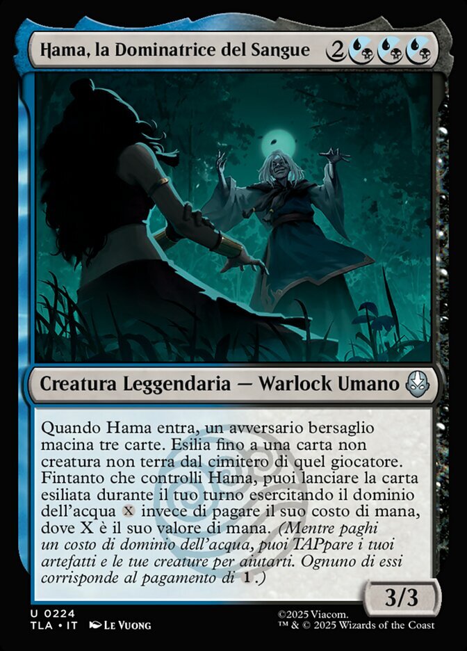 | Rules | When Hama enters, target opponent mills three cards. Exile up to one noncreature, nonland card from that player's graveyard. For as long as you control Hama, you may cast the exiled card during your turn by waterbending rather than paying its mana cost, where X is its mana value. (While paying a waterbend cost, you can tap your artifacts and creatures to help. Each one pays for .) |