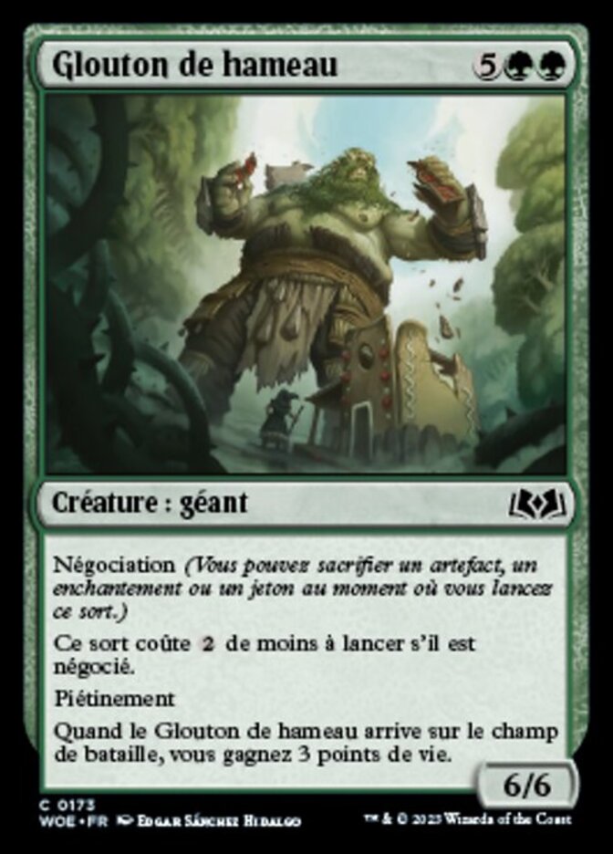 | Rules | Bargain (You may sacrifice an artifact, enchantment, or token as you cast this spell.) This spell costs less to cast if it's bargained. Trample When Hamlet Glutton enters the battlefield, you gain 3 life. |