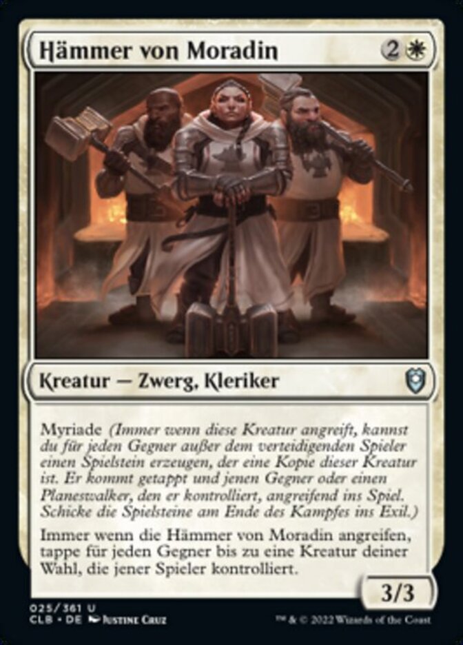 | Rules | Myriad (Whenever this creature attacks, for each opponent other than defending player, you may create a token that's a copy of this creature that's tapped and attacking that player or a planeswalker they control. Exile the tokens at end of combat.) Whenever Hammers of Moradin attacks, for each opponent, tap up to one target creature that player controls. |
