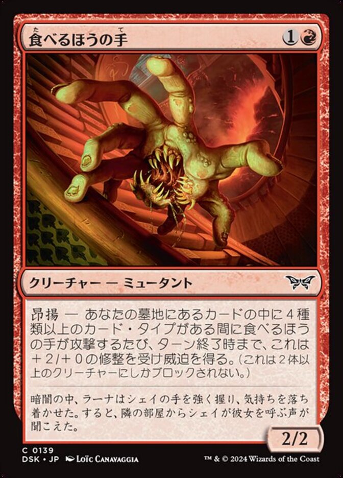 | Rules | Delirium — Whenever Hand That Feeds attacks while there are four or more card types among cards in your graveyard, it gets +2/+0 and gains menace until end of turn. (It can't be blocked except by two or more creatures.) |
