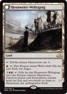 | Rules | : Add . , : Target creature gains haste until end of turn. , : If you both own and control Hanweir Battlements and a creature named Hanweir Garrison, exile them, then meld them into Hanweir, the Writhing Township. |