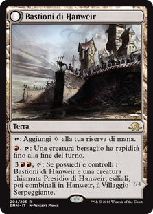 | Rules | : Add . , : Target creature gains haste until end of turn. , : If you both own and control Hanweir Battlements and a creature named Hanweir Garrison, exile them, then meld them into Hanweir, the Writhing Township. |