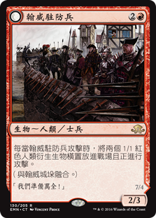 | Rules | Whenever Hanweir Garrison attacks, create two 1/1 red Human creature tokens that are tapped and attacking. (Melds with Hanweir Battlements.) |