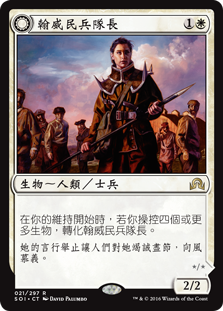 | Rules | At the beginning of your upkeep, if you control four or more creatures, transform Hanweir Militia Captain. // Westvale Cult Leader's power and toughness are each equal to the number of creatures you control. At the beginning of your end step, create a 1/1 white and black Human Cleric creature token. |