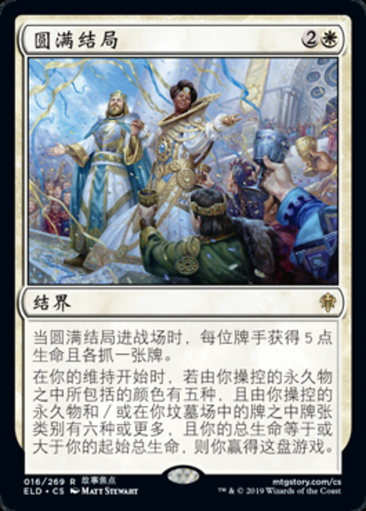 | Rules | When Happily Ever After enters the battlefield, each player gains 5 life and draws a card. At the beginning of your upkeep, if there are five colors among permanents you control, there are six or more card types among permanents you control and/or cards in your graveyard, and your life total is greater than or equal to your starting life total, you win the game. |