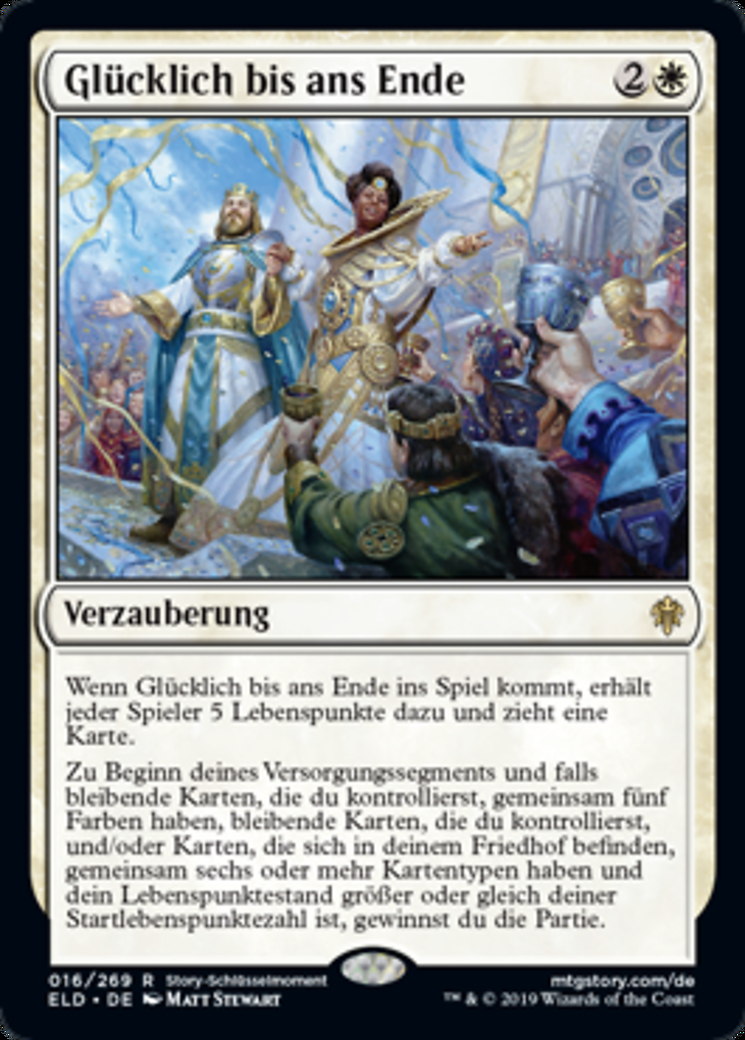 | Rules | When Happily Ever After enters the battlefield, each player gains 5 life and draws a card. At the beginning of your upkeep, if there are five colors among permanents you control, there are six or more card types among permanents you control and/or cards in your graveyard, and your life total is greater than or equal to your starting life total, you win the game. |