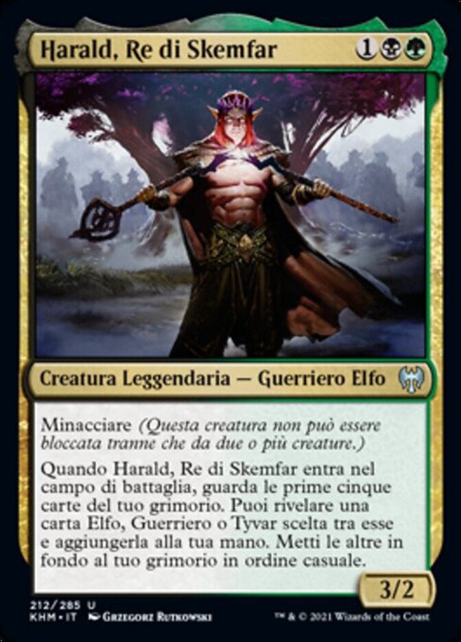 | Rules | Menace (This creature can't be blocked except by two or more creatures.) When Harald, King of Skemfar enters the battlefield, look at the top five cards of your library. You may reveal an Elf, Warrior, or Tyvar card from among them and put it into your hand. Put the rest on the bottom of your library in a random order. |