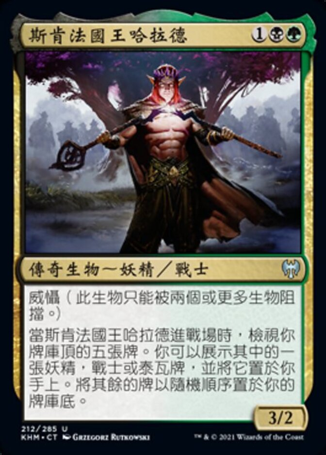 | Rules | Menace (This creature can't be blocked except by two or more creatures.) When Harald, King of Skemfar enters the battlefield, look at the top five cards of your library. You may reveal an Elf, Warrior, or Tyvar card from among them and put it into your hand. Put the rest on the bottom of your library in a random order. |