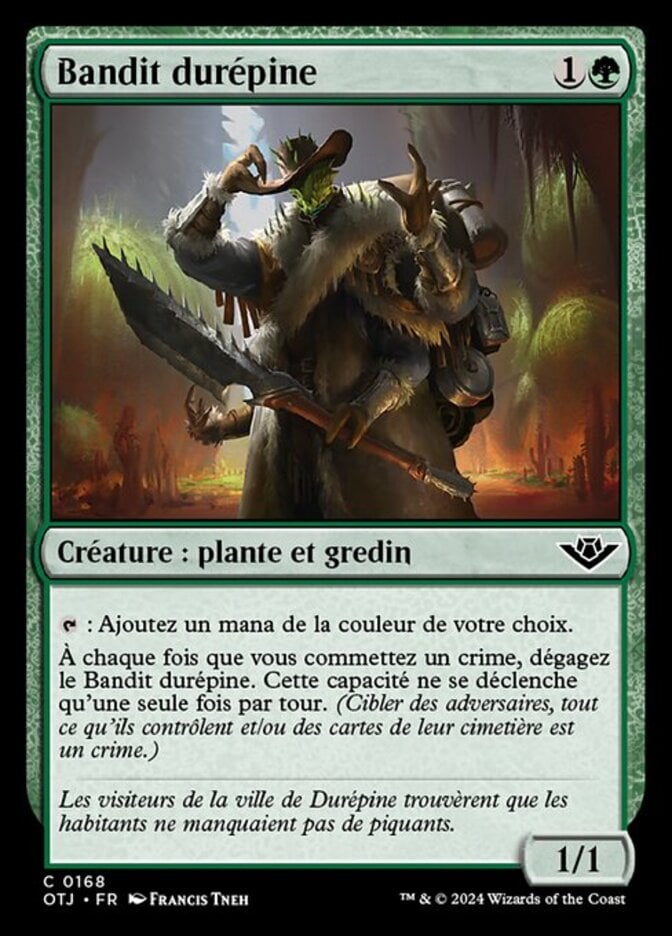 | Rules | : Add one mana of any color. Whenever you commit a crime, untap Hardbristle Bandit. This ability triggers only once each turn. (Targeting opponents, anything they control, and/or cards in their graveyards is a crime.) |