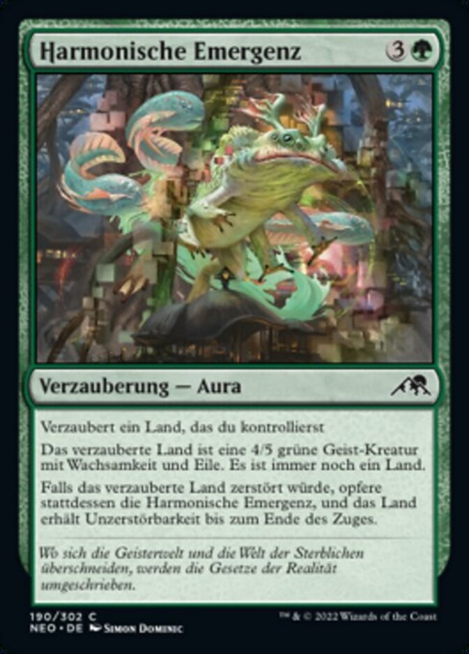 | Rules | Enchant land you control Enchanted land is a 4/5 green Spirit creature with vigilance and haste. It's still a land. If enchanted land would be destroyed, instead sacrifice Harmonious Emergence and that land gains indestructible until end of turn. |