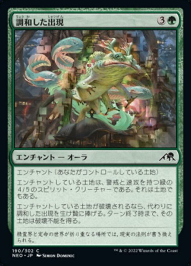 | Rules | Enchant land you control Enchanted land is a 4/5 green Spirit creature with vigilance and haste. It's still a land. If enchanted land would be destroyed, instead sacrifice Harmonious Emergence and that land gains indestructible until end of turn. |