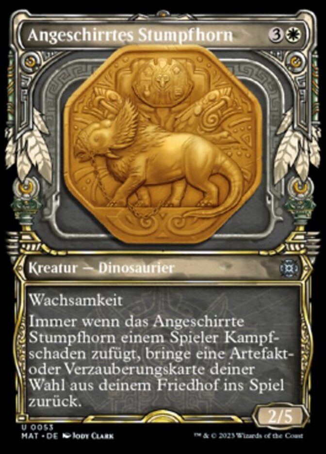 | Rules | Vigilance Whenever Harnessed Snubhorn deals combat damage to a player, return target artifact or enchantment card from your graveyard to the battlefield. |