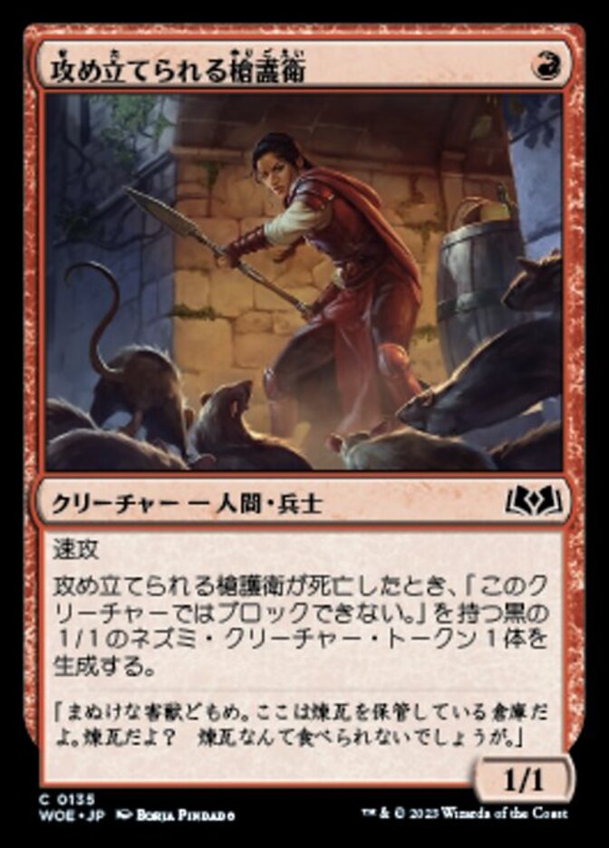 | Rules | Haste When Harried Spearguard dies, create a 1/1 black Rat creature token with "This creature can't block." |