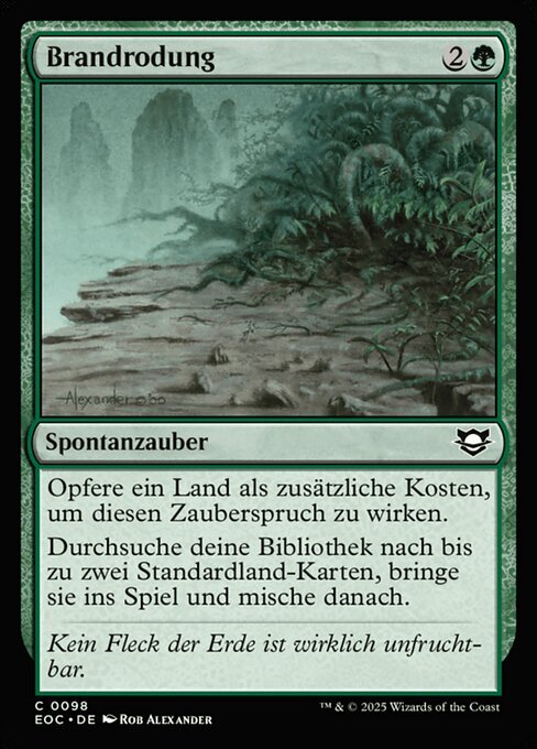| Rules | As an additional cost to cast this spell, sacrifice a land. Search your library for up to two basic land cards, put them onto the battlefield, then shuffle. |