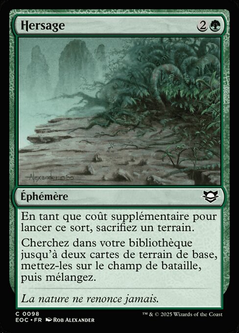 | Rules | As an additional cost to cast this spell, sacrifice a land. Search your library for up to two basic land cards, put them onto the battlefield, then shuffle. |