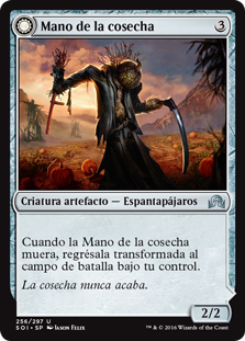 | Rules | When Harvest Hand dies, return it to the battlefield transformed under your control. // Equipped creature gets +1/+1. As long as equipped creature is a Human, it has menace. (It can't be blocked except by two or more creatures.) Equip |