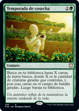 | Rules | Search your library for up to X basic land cards, where X is the number of tapped creatures you control, put those cards onto the battlefield tapped, then shuffle. |