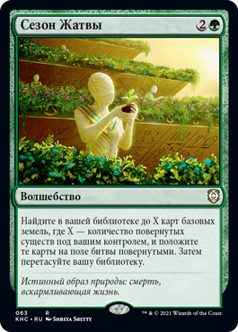 | Rules | Search your library for up to X basic land cards, where X is the number of tapped creatures you control, put those cards onto the battlefield tapped, then shuffle. |