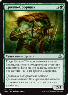 | Rules | When Harvester Troll enters the battlefield, you may sacrifice a creature or land. If you do, put two +1/+1 counters on Harvester Troll. |