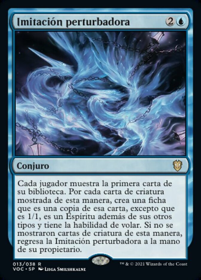 | Rules | Each player reveals the top card of their library. For each creature card revealed this way, create a token that's a copy of that card, except it's 1/1, it's a Spirit in addition to its other types, and it has flying. If no creature cards were revealed this way, return Haunting Imitation to its owner's hand. |