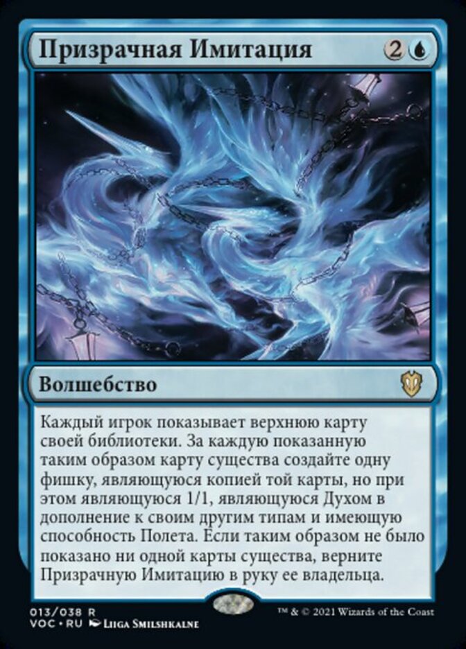 Rules Each player reveals the top card of their library. For each creature card revealed this way, create a token that's a copy of that card, except it's 1/1, it's a Spirit in addition to its other types, and it has flying. If no creature cards were revealed this way, return Haunting Imitation to its owner's hand.